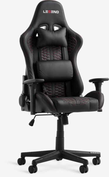Der NIBE Gaming-Stuhl von LEGEND vereint verstellbaren Komfort und stylisches Design, damit du mit Selbstvertrauen zocken kannst. Dank der mitgelieferten Kissen erhältst du angenehme Unterstützung für Nacken und den Lendenbereich. Armlehnen und Rückenlehne lassen sich individuell anpassen. Der Sitz ist mit weichem, schwarzem Stoff bezogen und hat schwarze Ziernähte in einem grafischen Muster. B70 x H126–136 x T70 cm