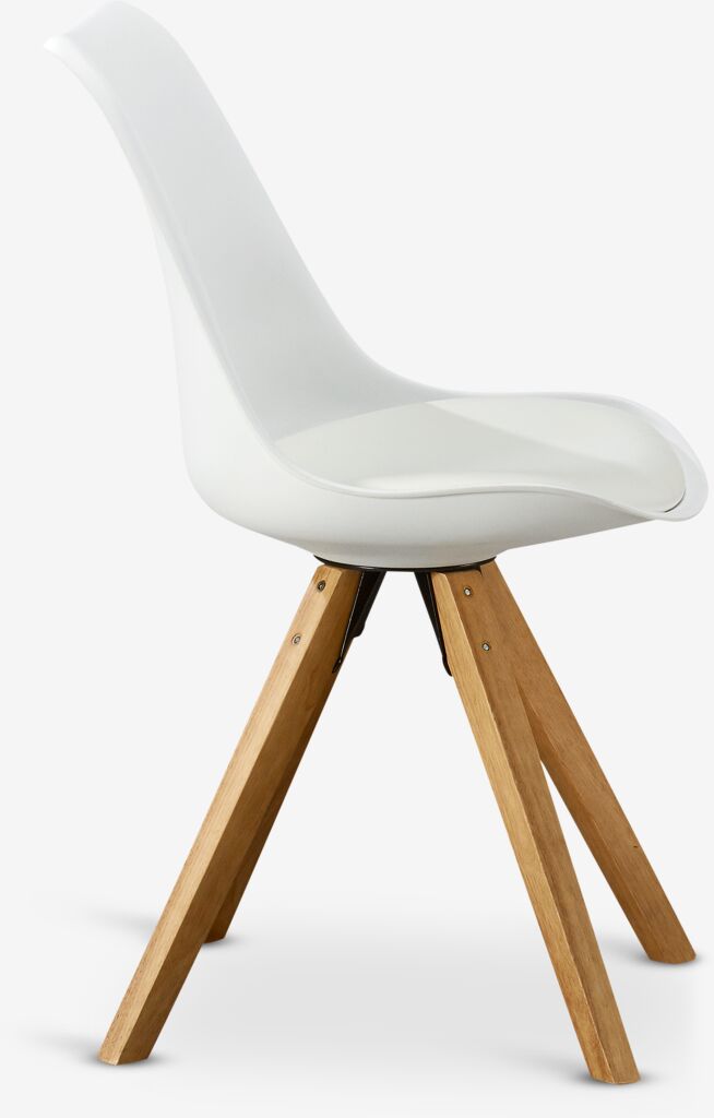 Esszimmerstuhl mit weißem geformtem Sitz und passendem fest montiertem Kunstlederkissen. Beine aus Massivholz.