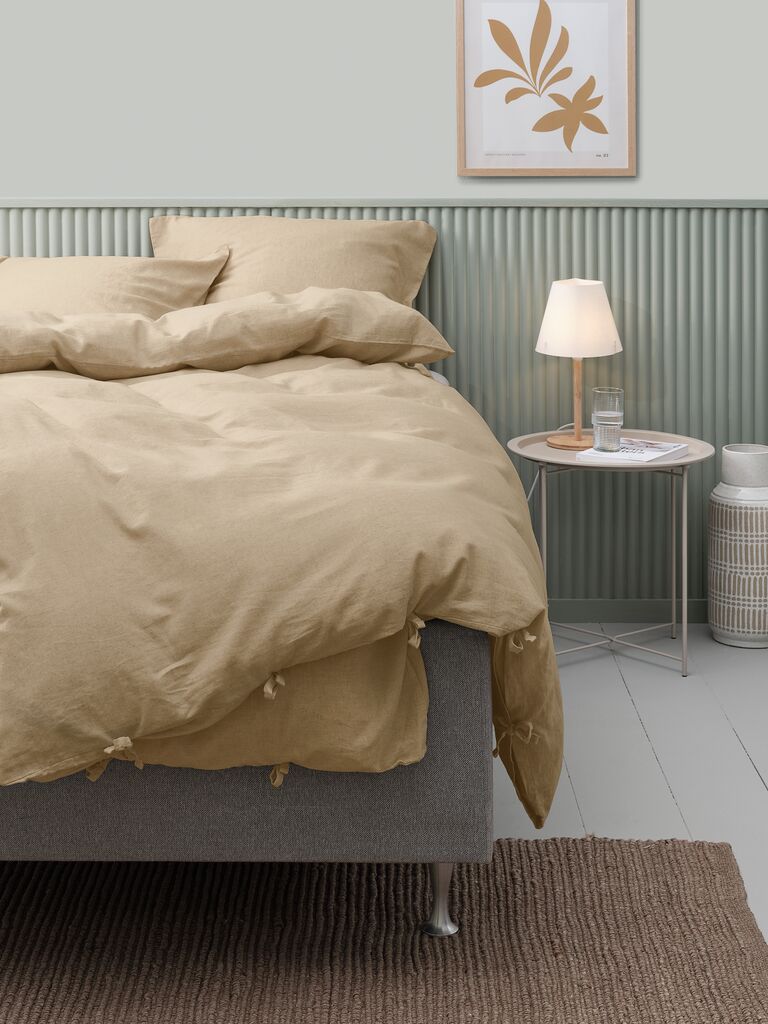Dette hørsengetøj er meget behageligt at sove i, da fugtigheden fra kroppen absorberes af det og selv om det er varmt, kan man sove frisk og behageligt. Strukturen i stoffet er lidt grovere, som hør plejer at være. Skønt med stropper til at binde enderne sammen på. Farven er i virkeligheden lidt til sandgul.