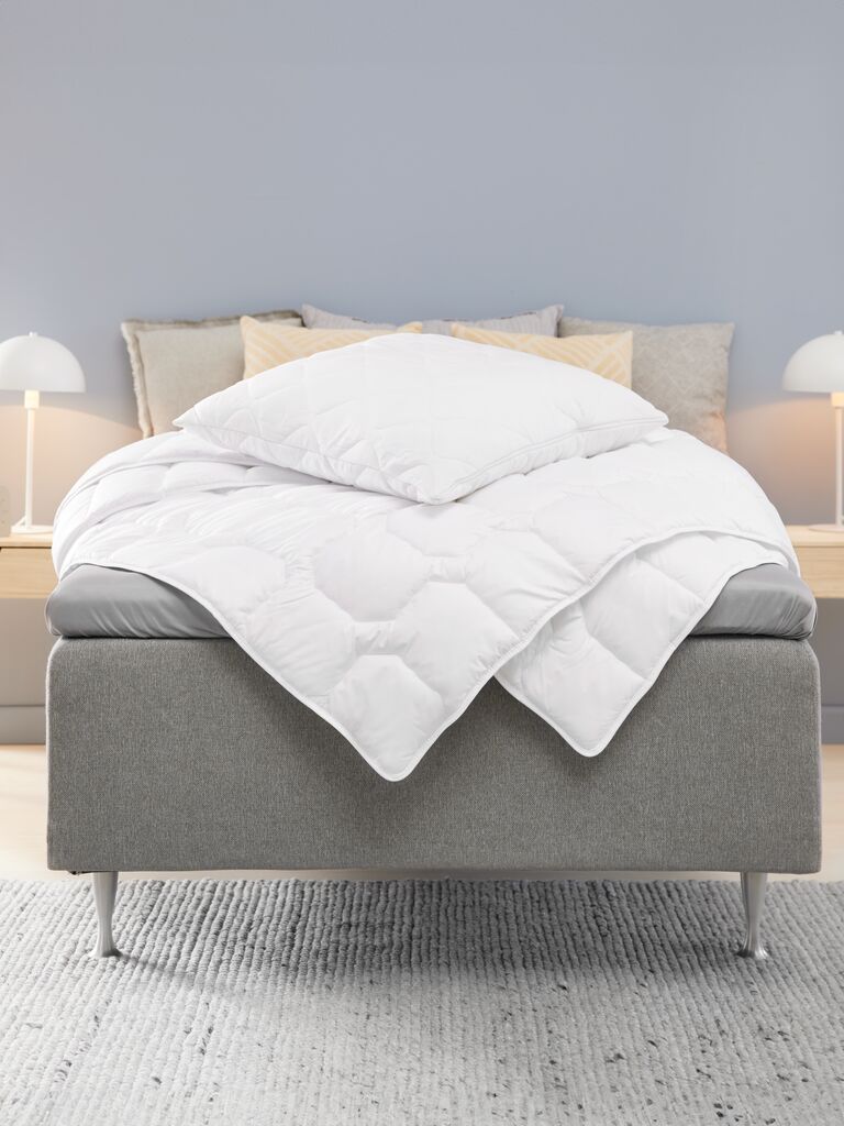 | Pflege | In einer Maschine mit mindestens 7 kg Fassungsvermögen waschen und trocknen. Regelmässig ausschütteln und lüften, nicht ausklopfen oder absaugen. |