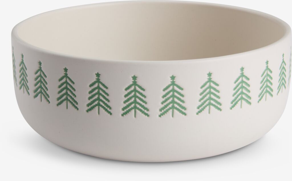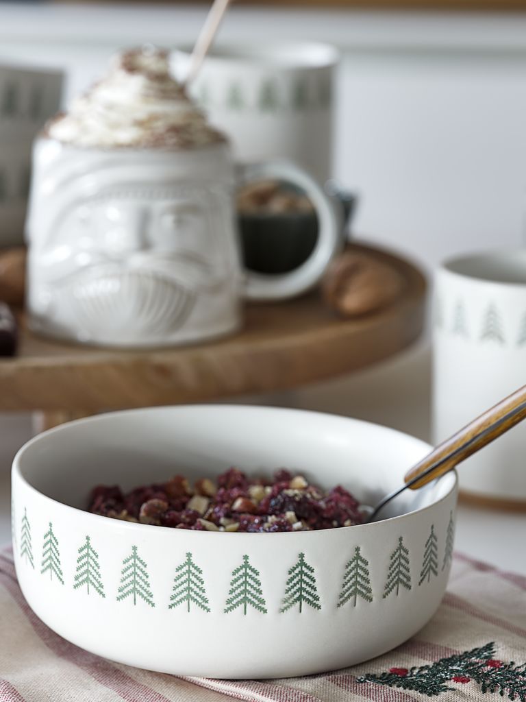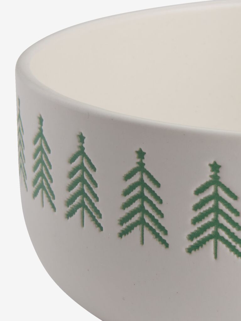 Schale aus mattweissem Steinzeug mit einem schlichten Muster aus grünen Weihnachtsbäumen. Sie eignet sich ideal zum Servieren von festlichen Snacks oder Müsli während der Weihnachtszeit. Die Schale ist spülmaschinenfest. Ø16 x H6 cm
