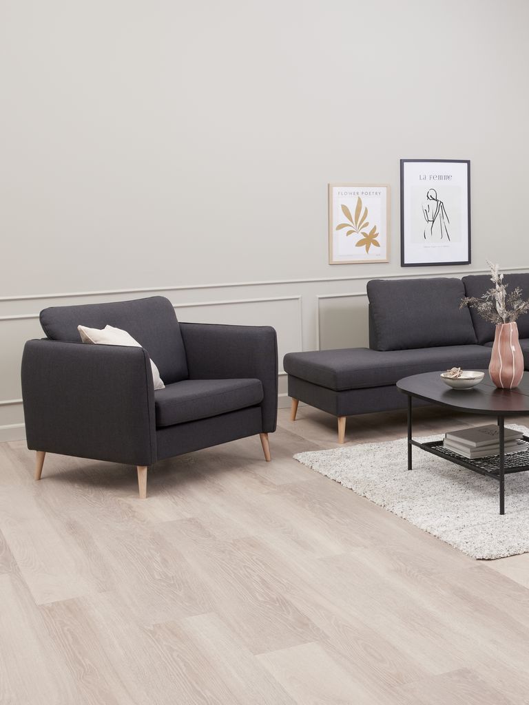 Fin fåtölj! Lätt att montera. Lite bredare än förväntat men då lägger man bara i en snygg kudde så är det klart.