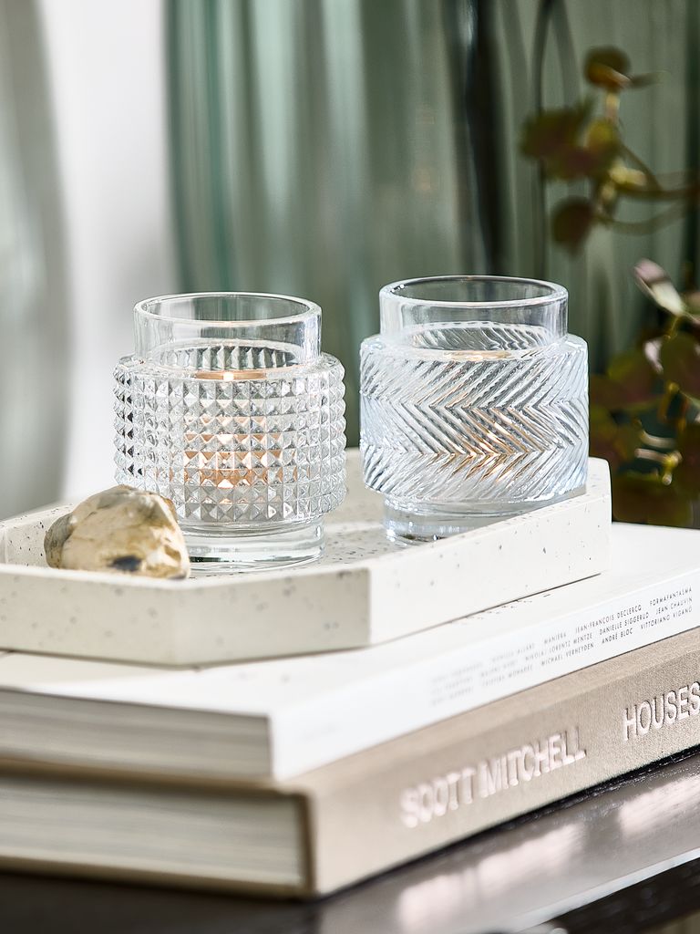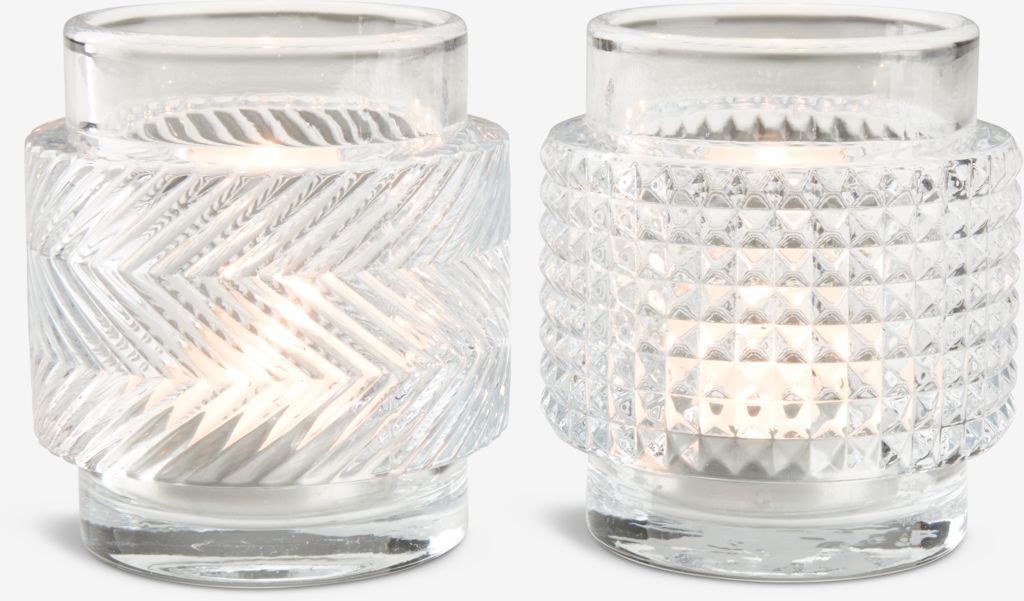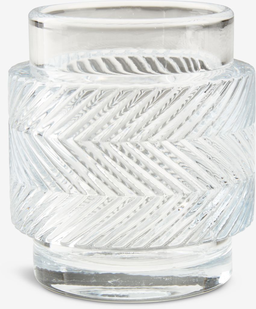 Photophore en verre transparent à motif texturé. Ce photophore apporte une touche élégante et lumineuse à votre décoration intérieure. Son design unique permet une diffusion douce et agréable de la lumière. Ø7 x H8 cm