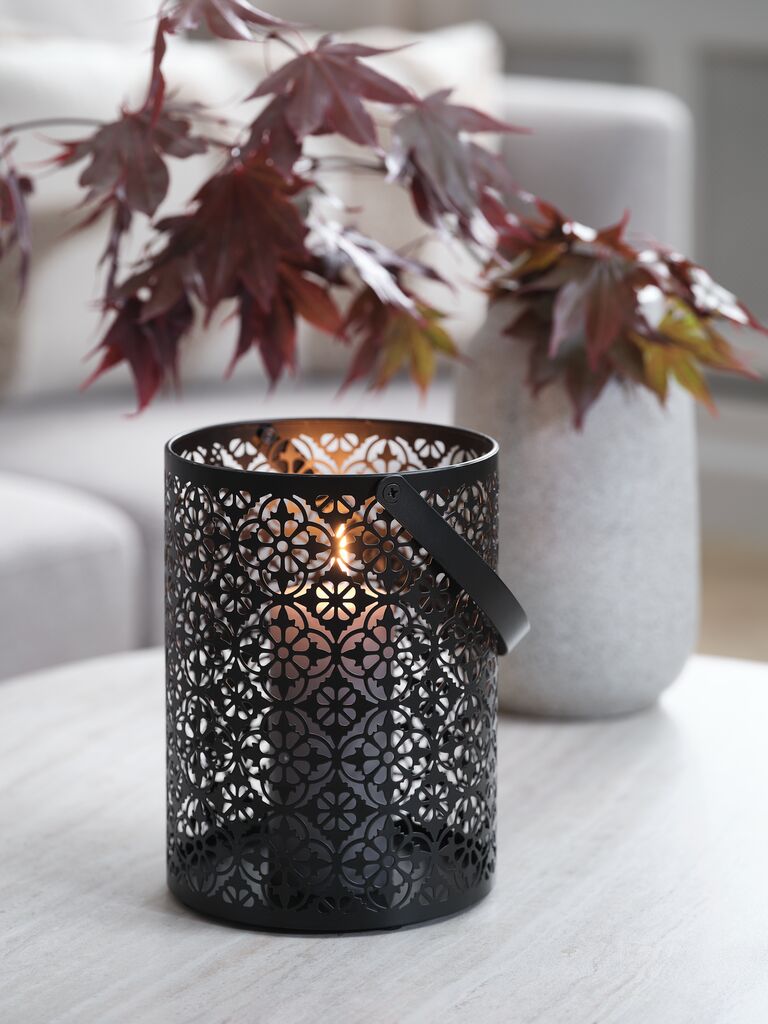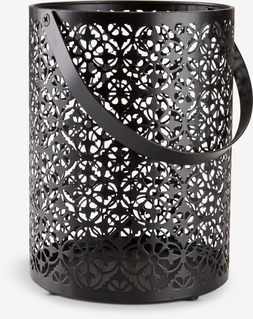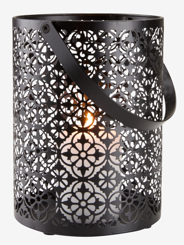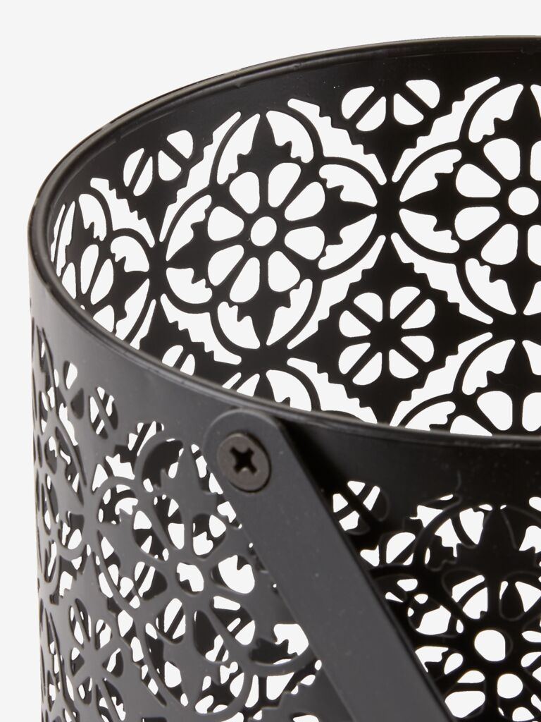 Photophore noir en acier avec un motif finement sculpté qui crée un magnifique jeu de lumière. Il est doté d'une poignée pratique. Ø15 x H20 cm