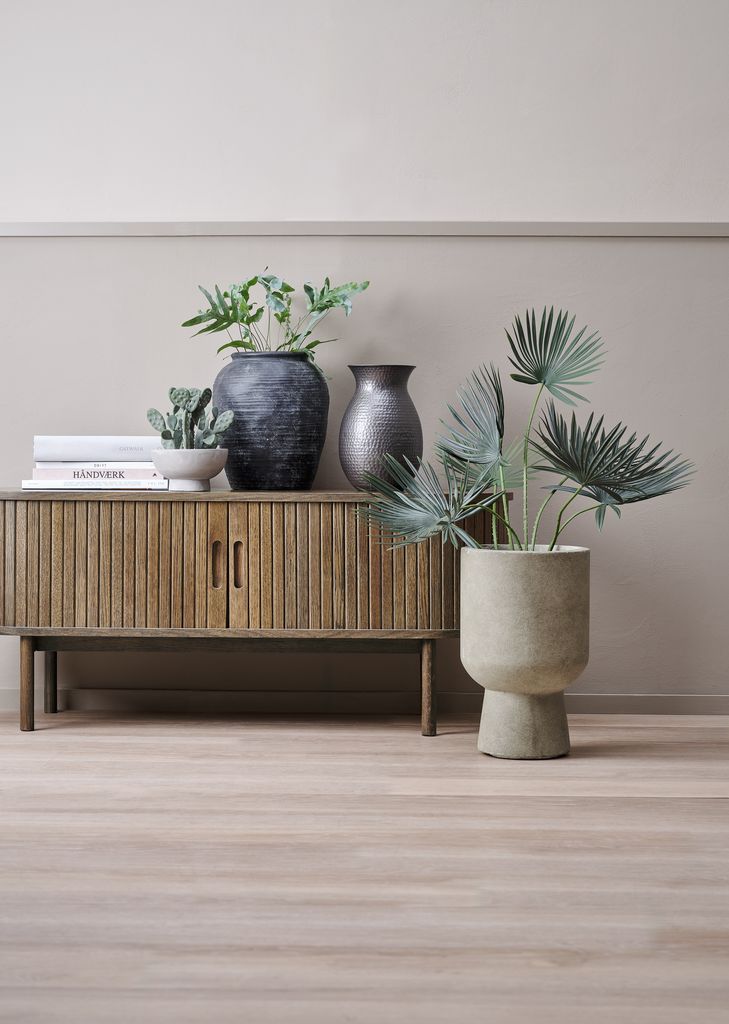 Vase noir en grès de forme large et d'apparence brute. Une pièce moderne pour votre décoration intérieure. Ø25 x H30 cm