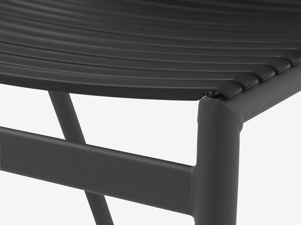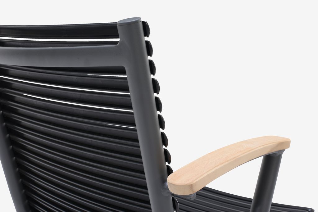 Leciuteńkie krzesło z pięknymi detalami z drewna i aluminium, no i do tego jeszcze ta historia z recyklingiem. Głęboką czerń i drewno, naprawdę dobre wzornictwo. Bardzo wygodne, nawet pod krzywe plecy poduszkowanie zupełnie niepotrzebne. Nie nagrzewają się na słońcu, nie chybocą i nie trzeszczą. Możliwość sztaplowania dopełnia wzorowej funkcjonalności.