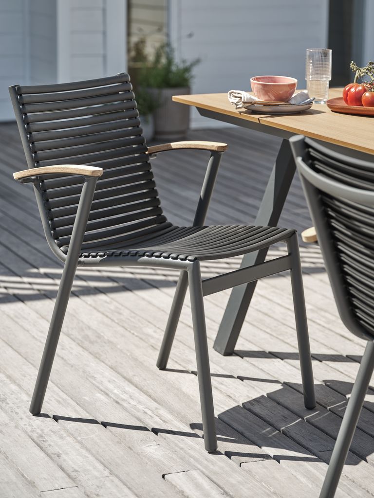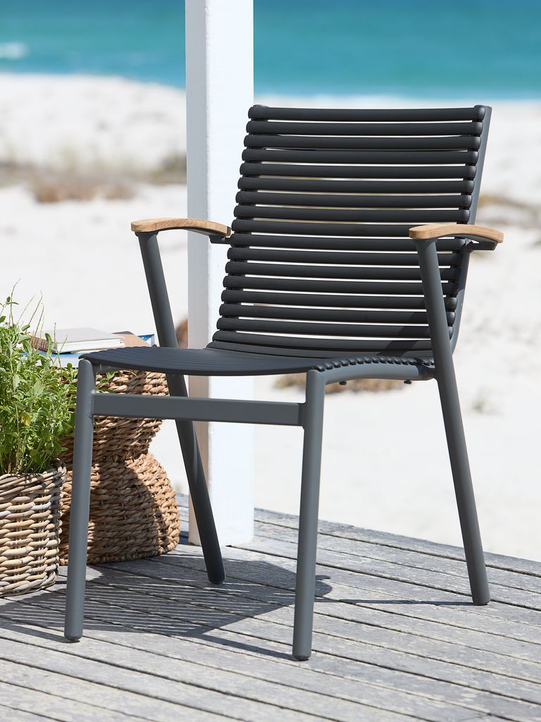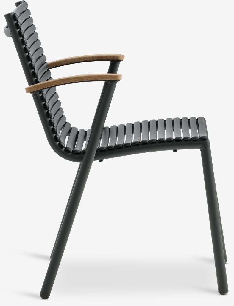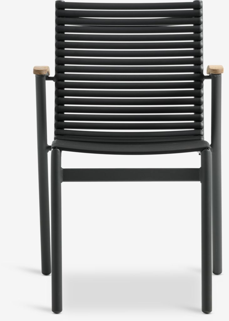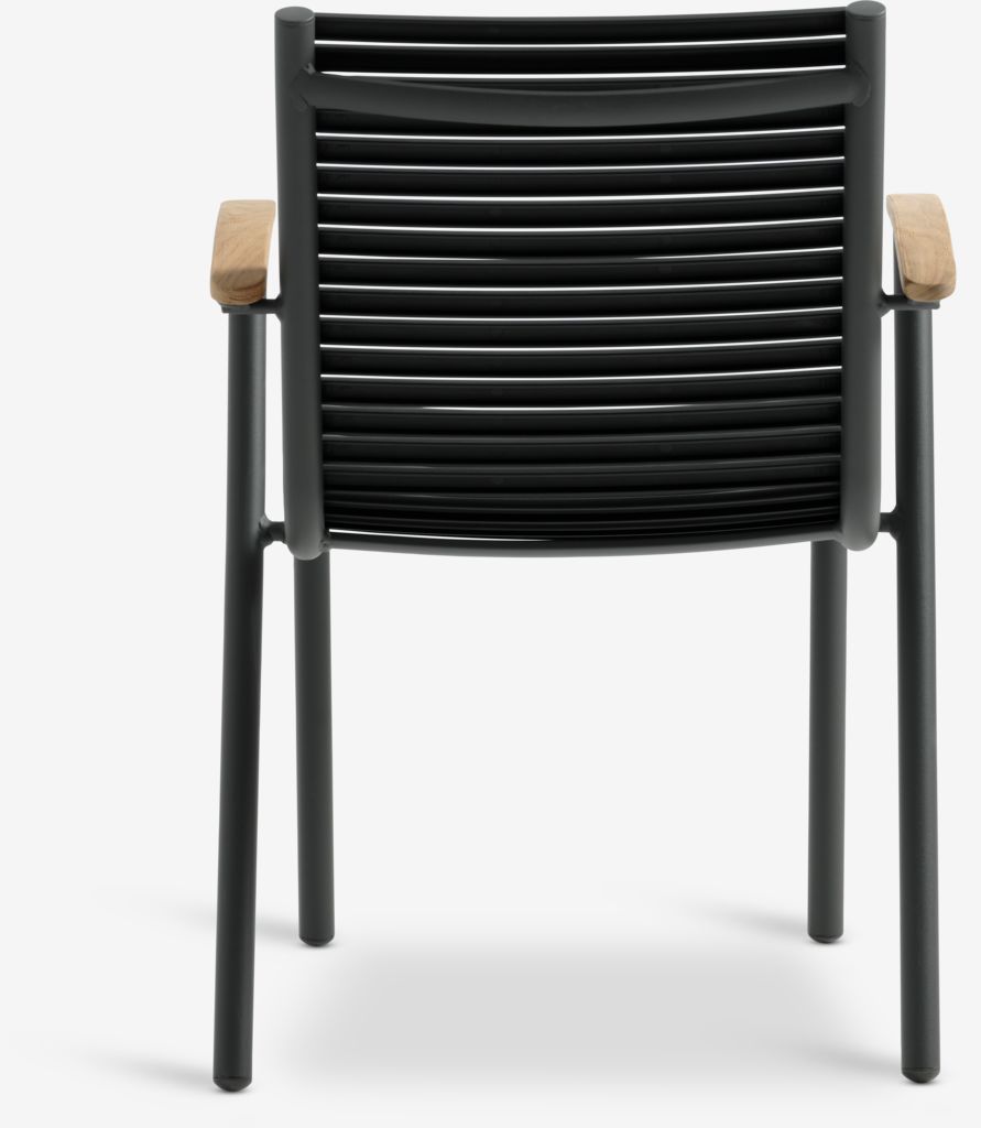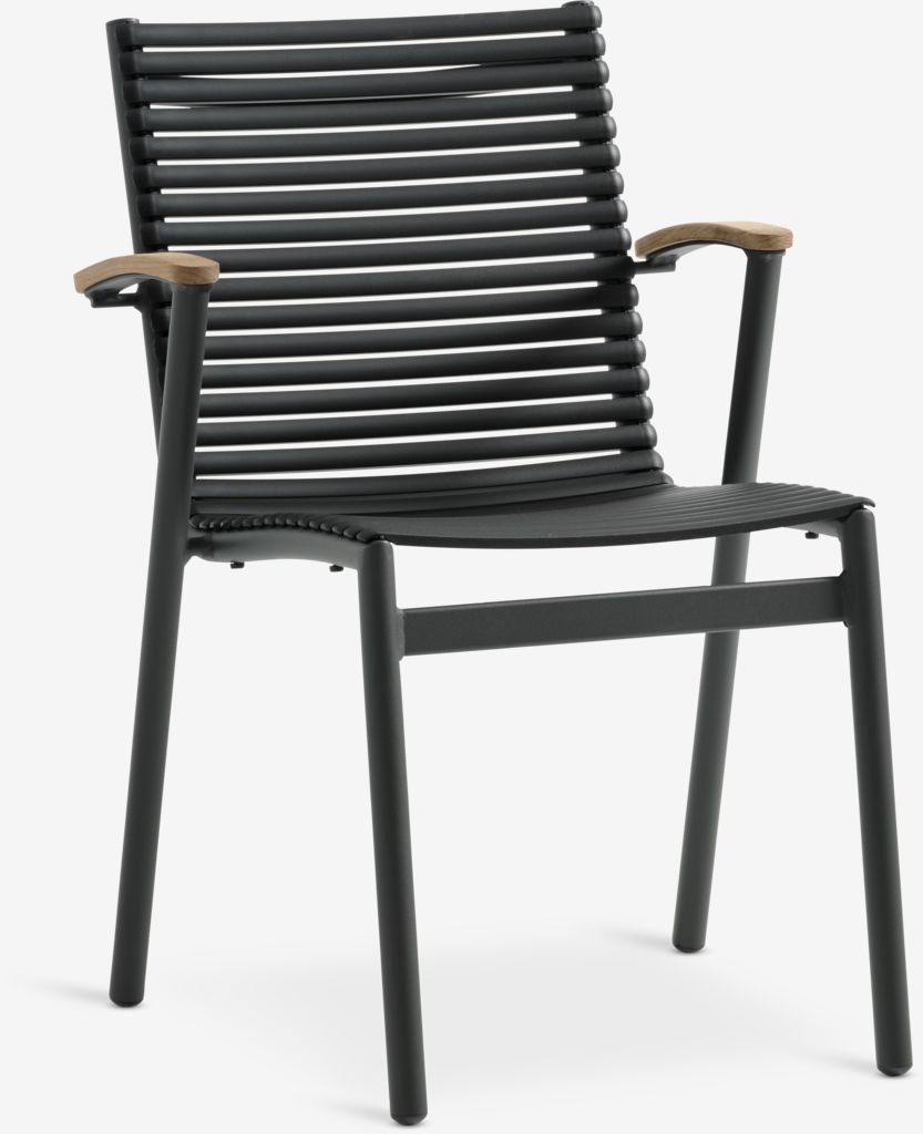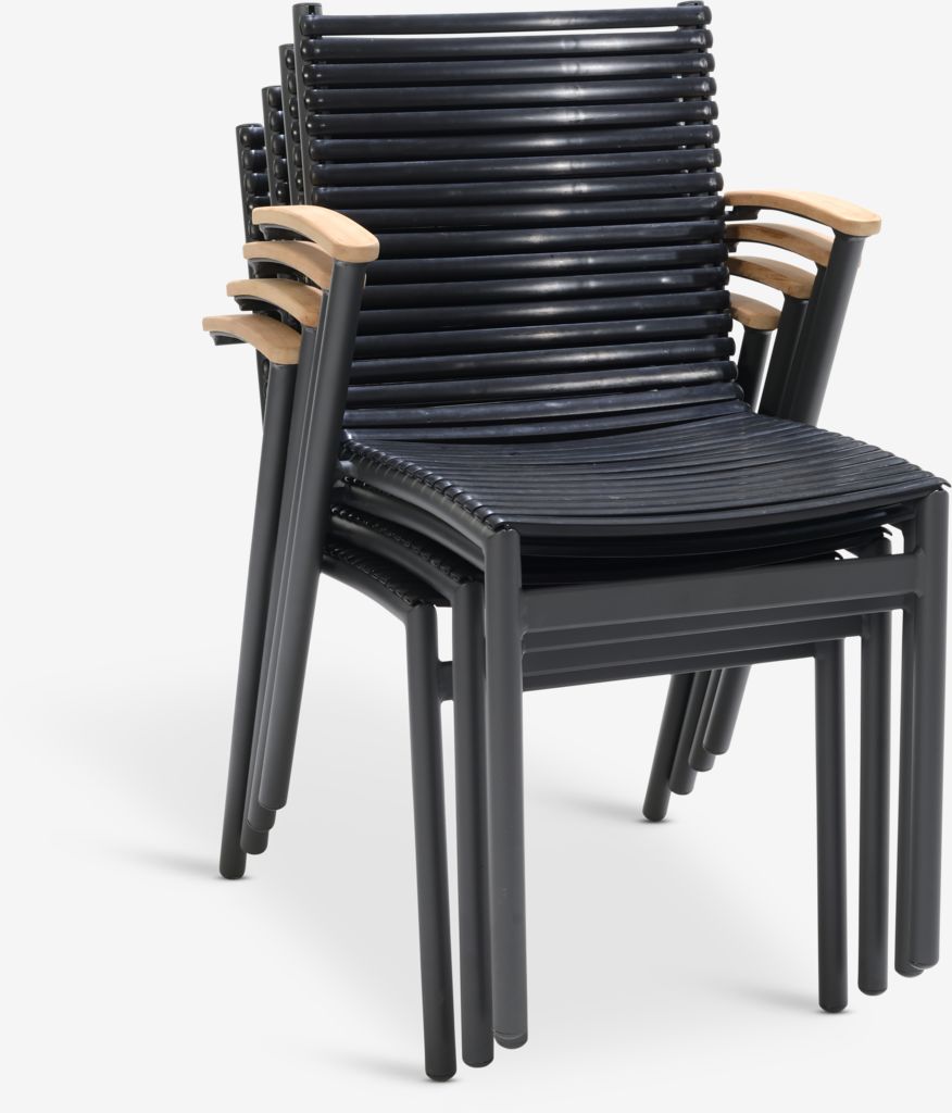 Chaise empilable noire avec assise et dossier en plastique et structure en aluminium peint par poudrage. Les accoudoirs sont en teck massif recyclé FSC®. Le plastique est protégé contre les UV afin d'éviter que sa couleur ne se décolore. Le teck est un bois dur élégant et durable qui contient une grande quantité d'huile naturelle, ce qui empêche l'humidité d'être absorbée par le bois. Avec le temps, le teck prend une patine gris argenté. L'aluminium est un matériau léger et robuste qui ne rouille pas. La chaise de jardin peut être empilée pour un rangement compact.