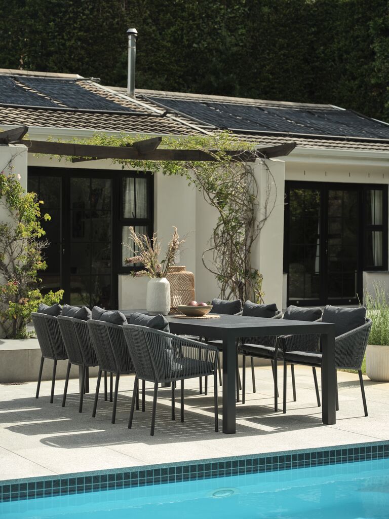 Table de jardin noire avec plateau en imitation bois. Comprend une rallonge pouvant être rangée sous le plateau. Cadre et pieds en aluminium peint par poudrage. Le bois artificiel (ou imitation bois) a l'apparence et la texture du bois naturel sans nécessiter d'entretien. L'aluminium est un matériau léger et robuste qui ne rouille pas. Vous pouvez facilement allonger la table jusqu'à 275 cm pour accueillir plus de personnes. l95 x L205 x H76 cm