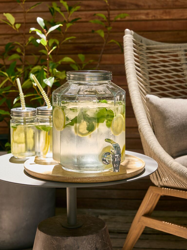 Bonbonne avec robinet en verre transparent avec un couvercle en acier inoxydable. Sa contenance de 4,25 litres est idéale pour servir des boissons fraîches lors de fêtes dans le jardin ou au camping. Un robinet intégré permet de se servir facilement. Ø18 x H24 cm