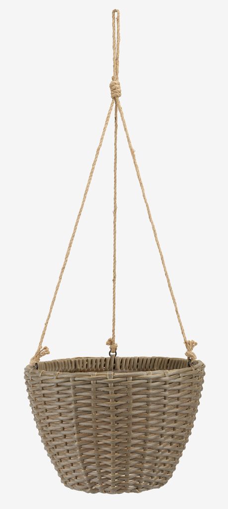 Jardinière suspendue en polyrotin et acier peint par poudrage, disponible en couleurs assorties. Cette jardinière résistante au gel est idéale pour être suspendue dans une pergola ou sous un demi-toit afin de créer une atmosphère verte et luxuriante. Ø27 x H19 cm