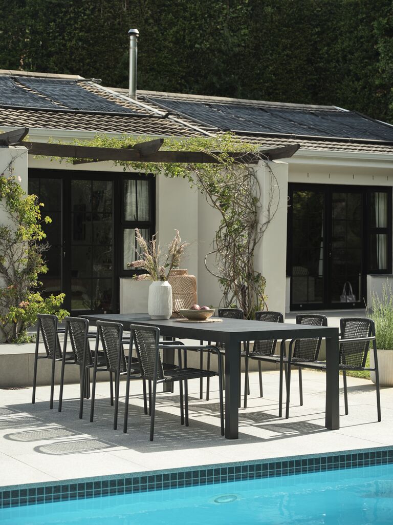 Table de jardin noire avec plateau en imitation bois. Comprend une rallonge pouvant être rangée sous le plateau. Cadre et pieds en aluminium peint par poudrage. Le bois artificiel (ou imitation bois) a l'apparence et la texture du bois naturel sans nécessiter d'entretien. L'aluminium est un matériau léger et robuste qui ne rouille pas. Vous pouvez facilement allonger la table jusqu'à 275 cm pour accueillir plus de personnes. l95 x L205 x H76 cm