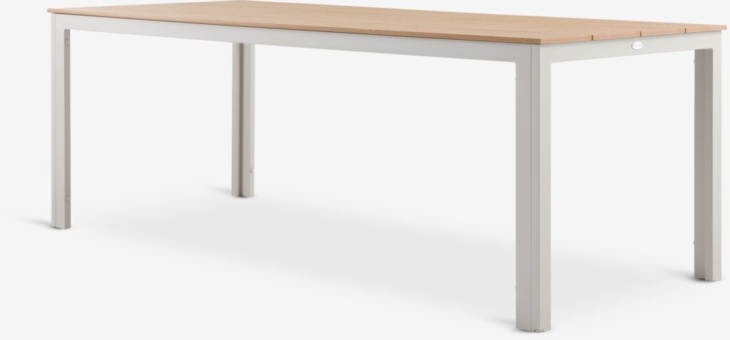 Table de jardin avec un plateau en imitation bois. Le cadre beige et les pieds sont en aluminium peint par poudrage. Le bois artificiel (ou imitation bois) a l'apparence et la texture du bois naturel sans nécessiter d'entretien. L'aluminium est un matériau léger et robuste qui ne rouille pas. l90 x L205 x H74 cm