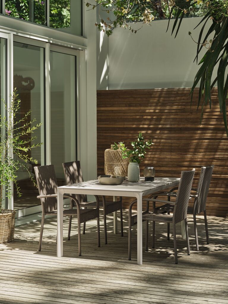 Table de jardin beige avec un plateau en céramiques. Le cadre et les pieds sont en aluminium peint par poudrage. La céramique résiste aux rayures, aux taches et à la chaleur. L'aluminium est un matériau léger et robuste qui ne rouille pas. l95 x L150 x H74 cm