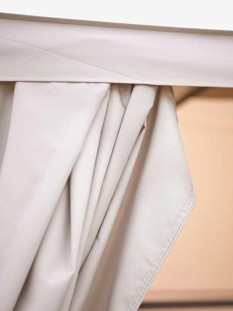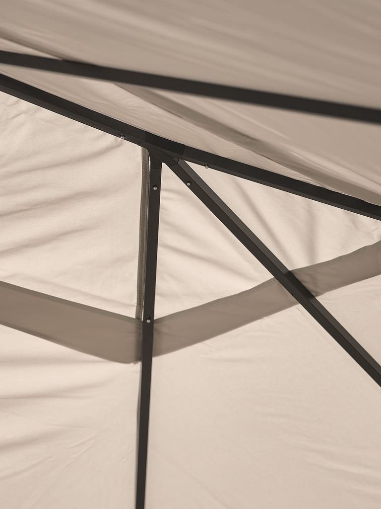 La toile est vendue avec 4 panneaux latéraux amovibles qui se fixent facilement à la structure en acier à l'aide de bandes auto-agrippantes et de cordons. Les panneaux sont idéals pour se protéger contre le léger vent et la pluie. Lorsque le temps est clément, vous pouvez attacher les panneaux aux poteaux de la tonelle pour les garder à l'écart. Les parois latérales sont dépourvus de fenêtres.