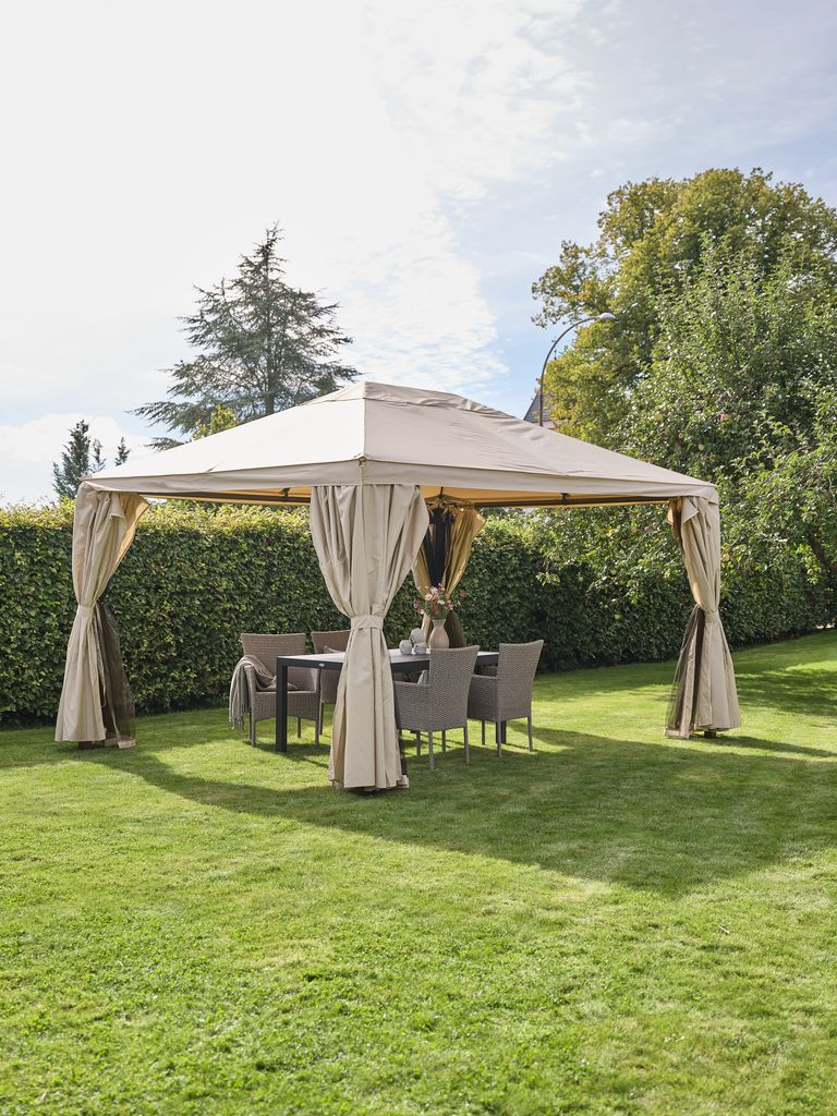 La tonnelle NORDMARKA est destinée à ceux qui aiment réunir des gens et profiter de leur espace extérieur. La toile beige résiste aux pluies légères et est protégée contre les UV afin de préserver sa couleur. Les panneaux latéraux et les moustiquaires inclus vous offriront, à vous et à vos convives, un abri et un confort optimal.