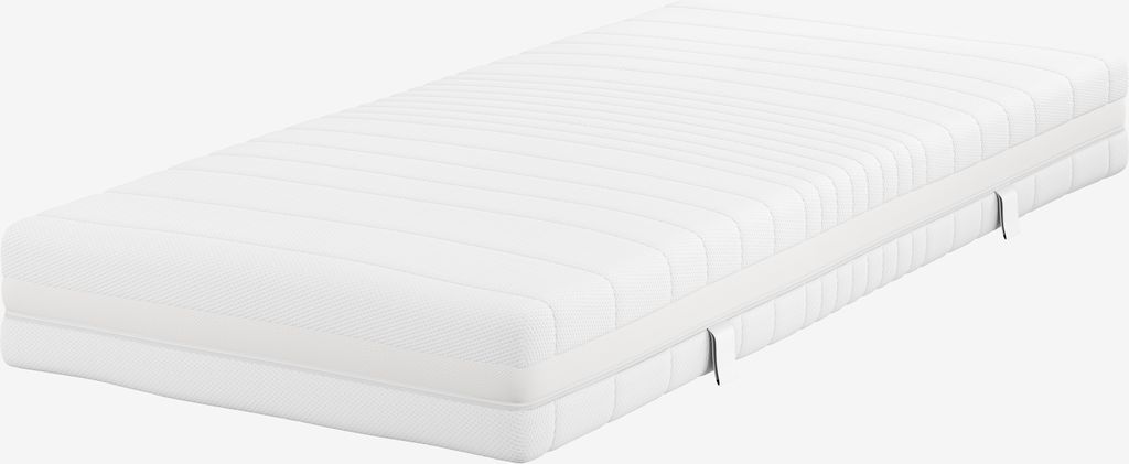Materasso di qualità 90x200 cm alto 22 cm con molle insacchettate 240/m², diviso in 11 zone comfort. Il materasso è imbottito con memory che allevia la pressione da un lato e schiuma di polietere dall'altro. Il memory foam si adatta precisamente al corpo. Fodera lavabile in 100% poliestere (31% riciclato) con trapuntatura spessa e morbida.