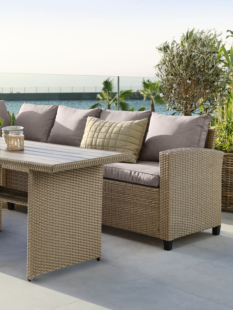 I cuscini di seduta e schienale di alta gamma inclusi ti permetteranno di sederti e rilassarti con il massimo comfort. I cuscini sono dotati di una resistente fodera in tessuto strutturato, che li rende resistenti all'usura. Riponili all'interno quando non li utilizzi per proteggerli dagli agenti atmosferici e prolungarne la durata.