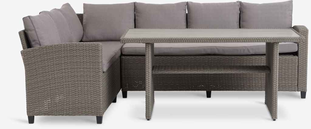Godetevi il vostro spazio esterno con il set da salotto AGERMOSE. Questo set a 6 posti è composto da un divano angolare con comodi cuscini e un tavolo da salotto abbinato con piano in legno artificiale. Il divano lounge è dotato di un pratico vano portaoggetti sotto la seduta.