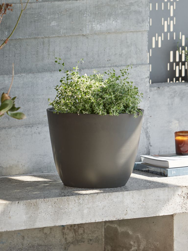 Grande fioriera da giardino in polystone grigio antracite resistente al gelo. Con questa fioriera puoi esporre le tue piante in modo semplice ed elegante. È possibile realizzare facilmente un foro di drenaggio per garantire che l'acqua in eccesso possa defluire. Ø41 x H33 cm