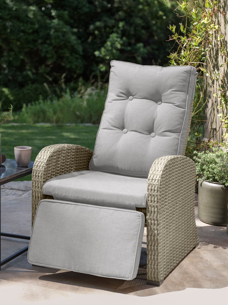 Poltrona lounge in alluminio e polyrattan. Schienale e poggiagambe regolabili in maniera continua. Incl. cuscino di alta qualità con rivestimento in tessuto strutturato resistente. L66 x H102 x P80 cm