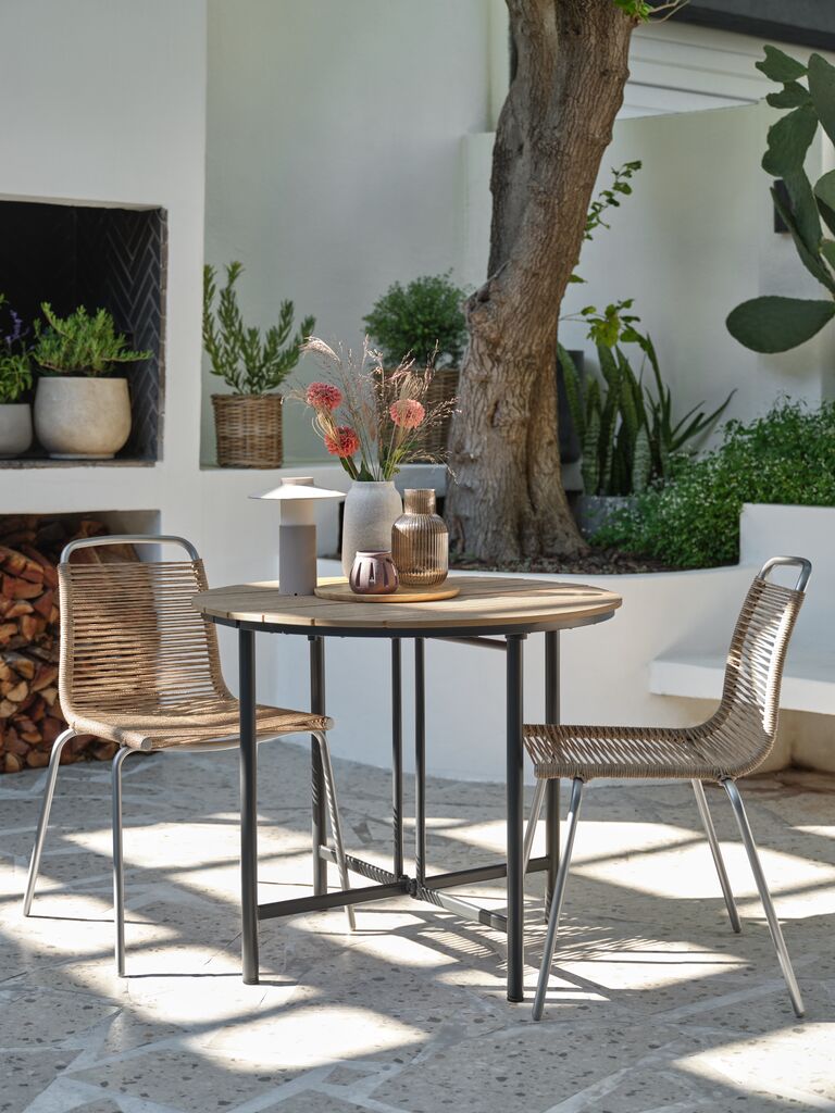 Set bistrò 2 posti. Tavolo: acciaio e legno artificiale. Con 2 prolunghe. Il tavolo può essere completamente o parzialmente ripiegato. P90 x L18/54/90 x H74 cm. Sedia: acciaio e polyrattan. Impilabile.