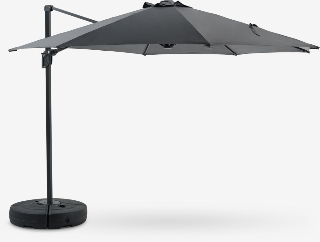 L'ombrellone laterale TRONDHEIM unisce stile e funzionalità. Questo ombrellone da giardino grigio offre ombra regolabile grazie alla funzione inclinabile, protezione UV, resistenza all'acqua e una base robusta. Ø300 x H246 cm