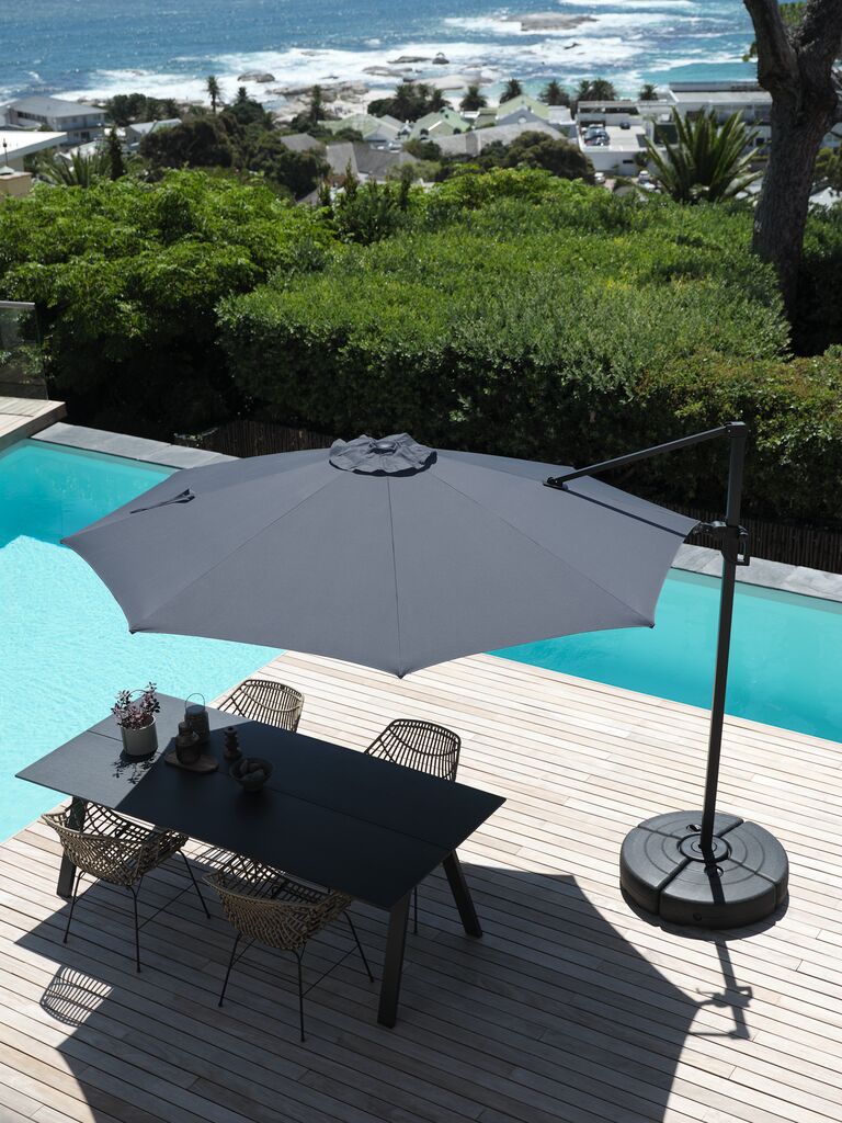 L'ombrellone laterale TRONDHEIM è dotato di una funzione inclinabile che permette di inclinare la testa dell'ombrellone per fornire ombra in un altro angolo. Questo è particolarmente utile al mattino o nel tardo pomeriggio quando il sole è più basso nel cielo.