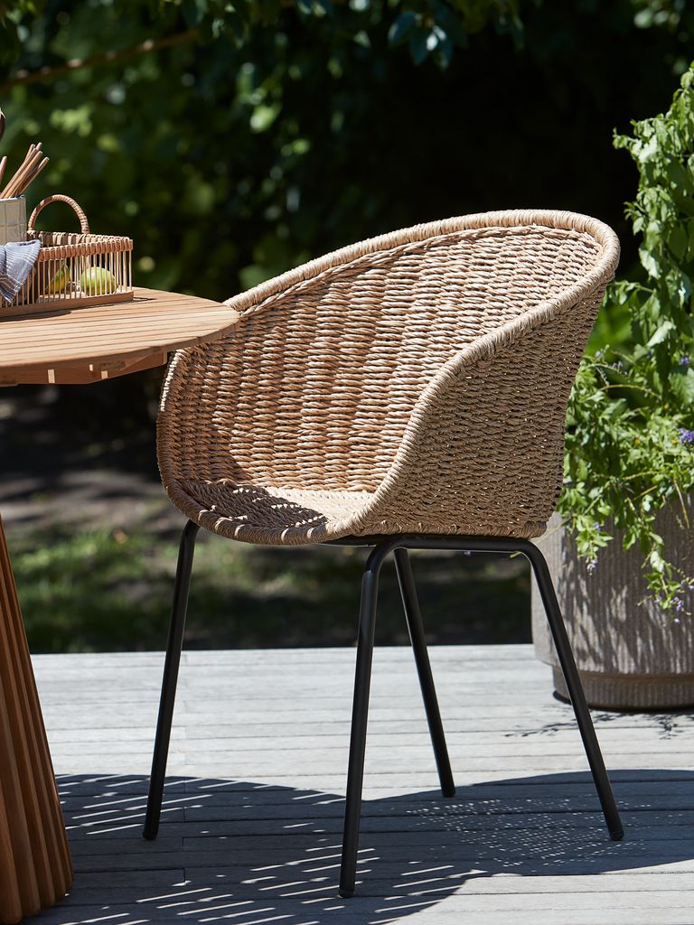 Sedia da giardino con seduta in polyrattan e gambe nere in acciaio verniciato a polvere. Il polyrattan offre un aspetto naturale simile al vimini, ed è resistente alle intemperie e senza necessità di manutenzione.