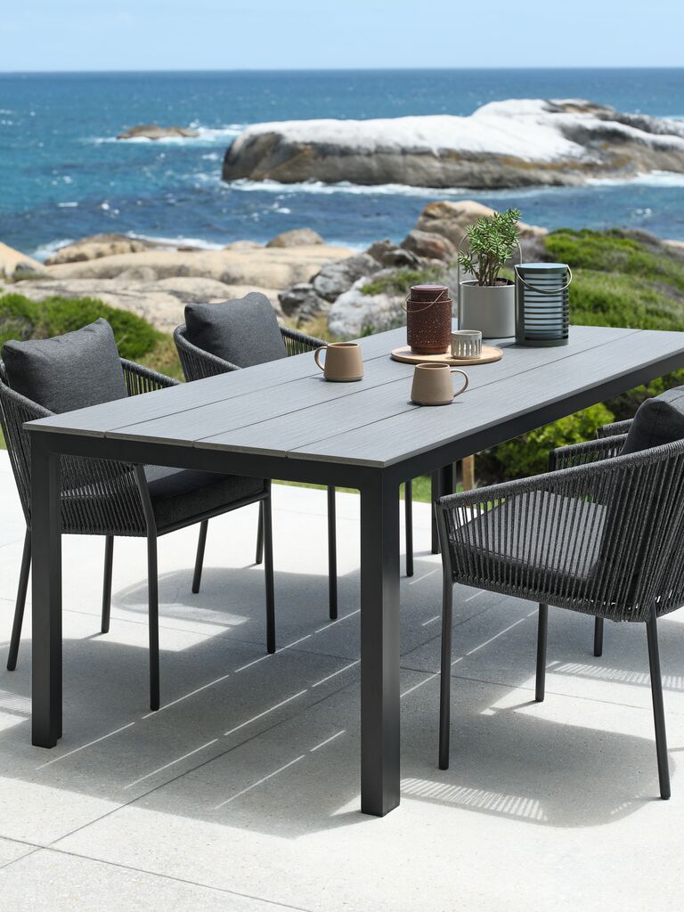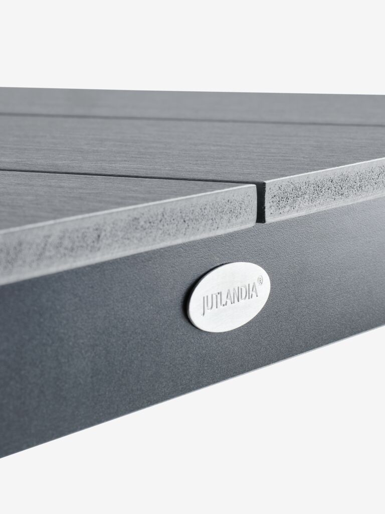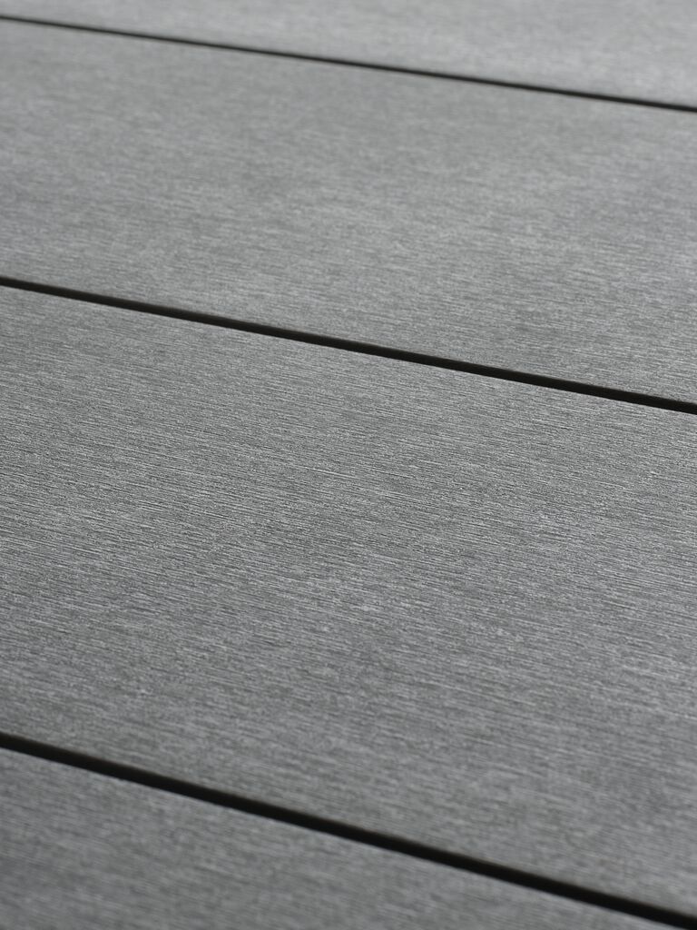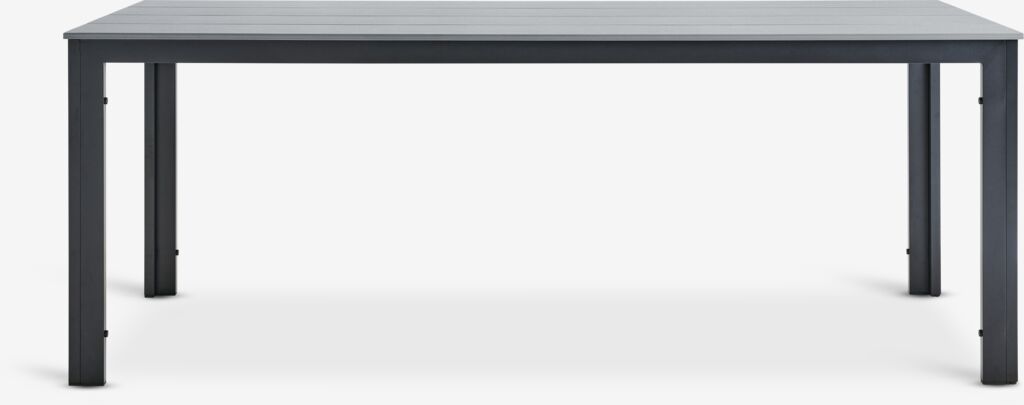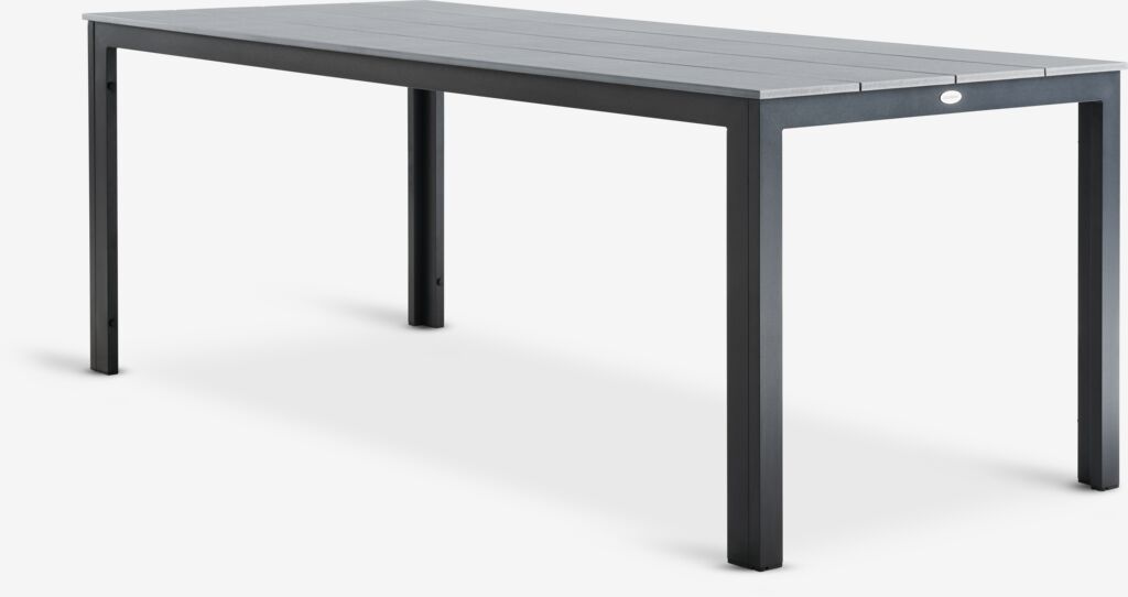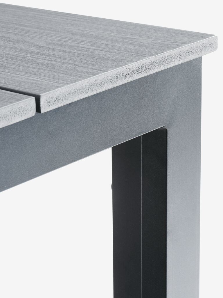 Tavolo da giardino grigio con piano in legno artificiale. Struttura e gambe in alluminio verniciato a polvere. Il legno artificiale riproduce l’aspetto e la texture del legno naturale ma non richiede manutenzione. L’alluminio è un materiale leggero e robusto che non arrugginisce. P90 x L205 x H74 cm
