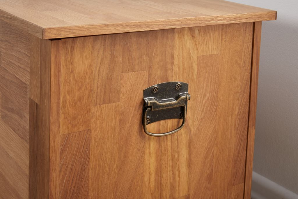 Die Qualität dieser Truhe ist dermassen schlecht, dass man sie im Prinzip gar nicht aufbauen kann. Es handelt sich um furniertes Sperrholz, auch bei tragenden Elementen, in die dann relative schwere Griffe und Scharniere gebohrt werden müssen. Für diese gibt es lächerlich kurze Schrauben, die aufgrund ihrer Länge teilweise gar nicht im Holz greifen können. Da wo es gelingt, brechen die Schrauben aufgrund der Schwere der metallenen Griffe und Scharniere aus. Kurz - die Truhe ist nicht brauchbar, schade, mit etwas höherwertigem Material liesse sich das lösen.