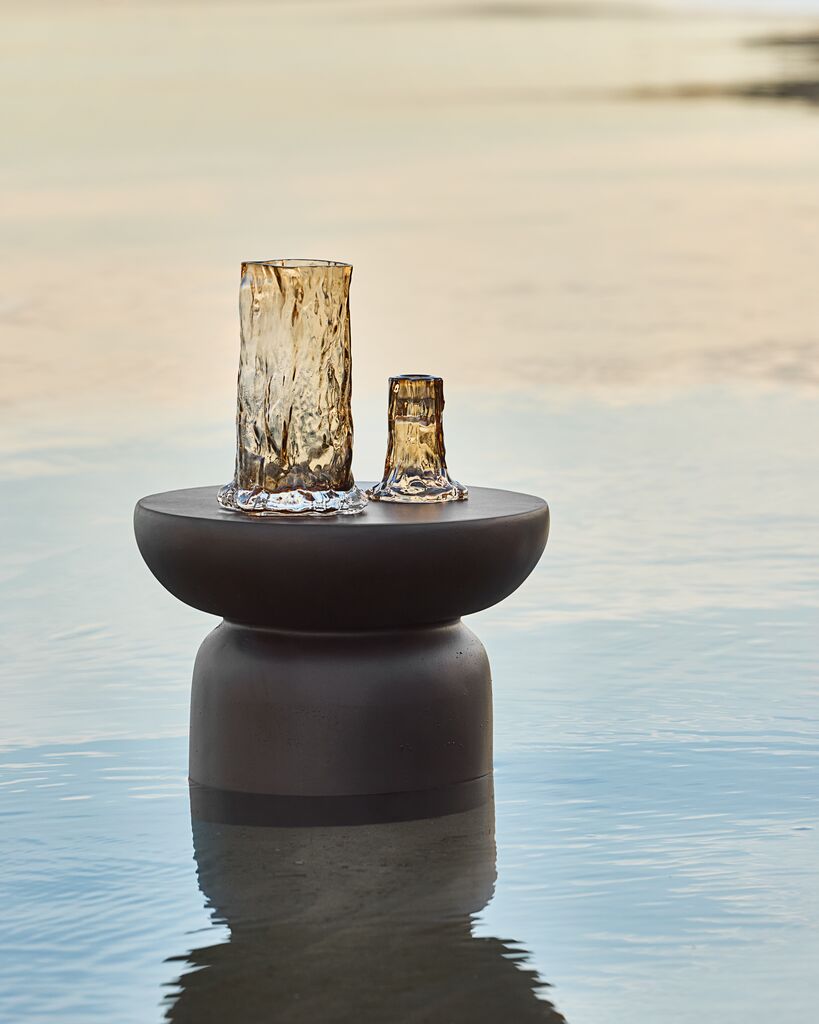 Candeliere in vetro color mandorla. Presenta un design unico e fluido dalla forma organica che crea un'espressione artistica. Ø9 x H10 cm