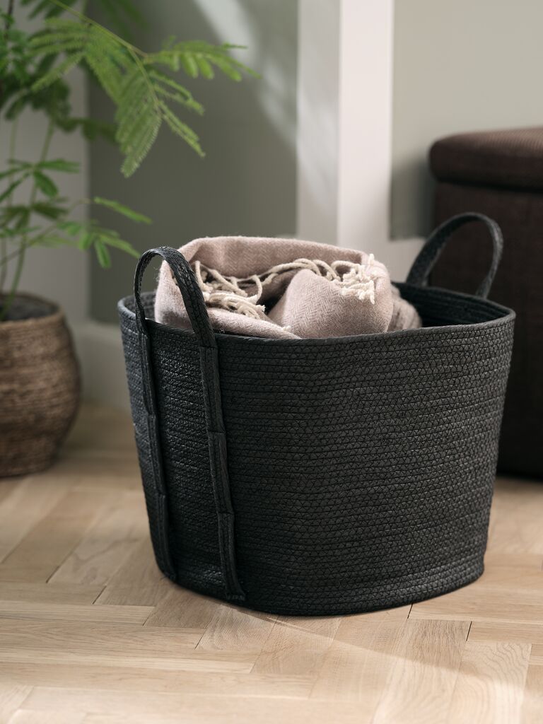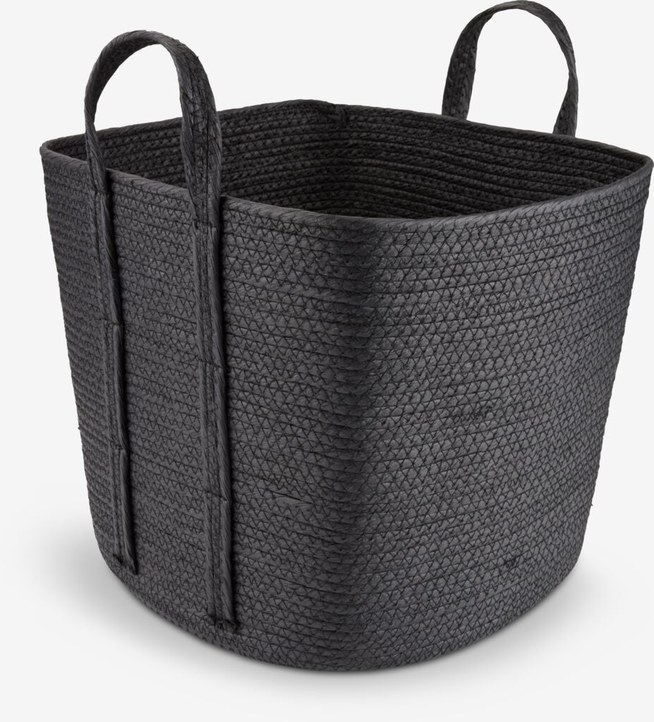 Cesto nero realizzato in filo di carta, ideale per riporre coperte, giocattoli e altro nei soggiorni o nei bagni. Dotato di pratiche maniglie. P37 x L37 x H32 cm
