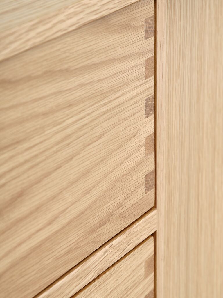 Rovere massello e impiallacciatura di rovere. Con ante scorrevoli. Cassetti con apertura push-open. P140 x H77 x P40 cm