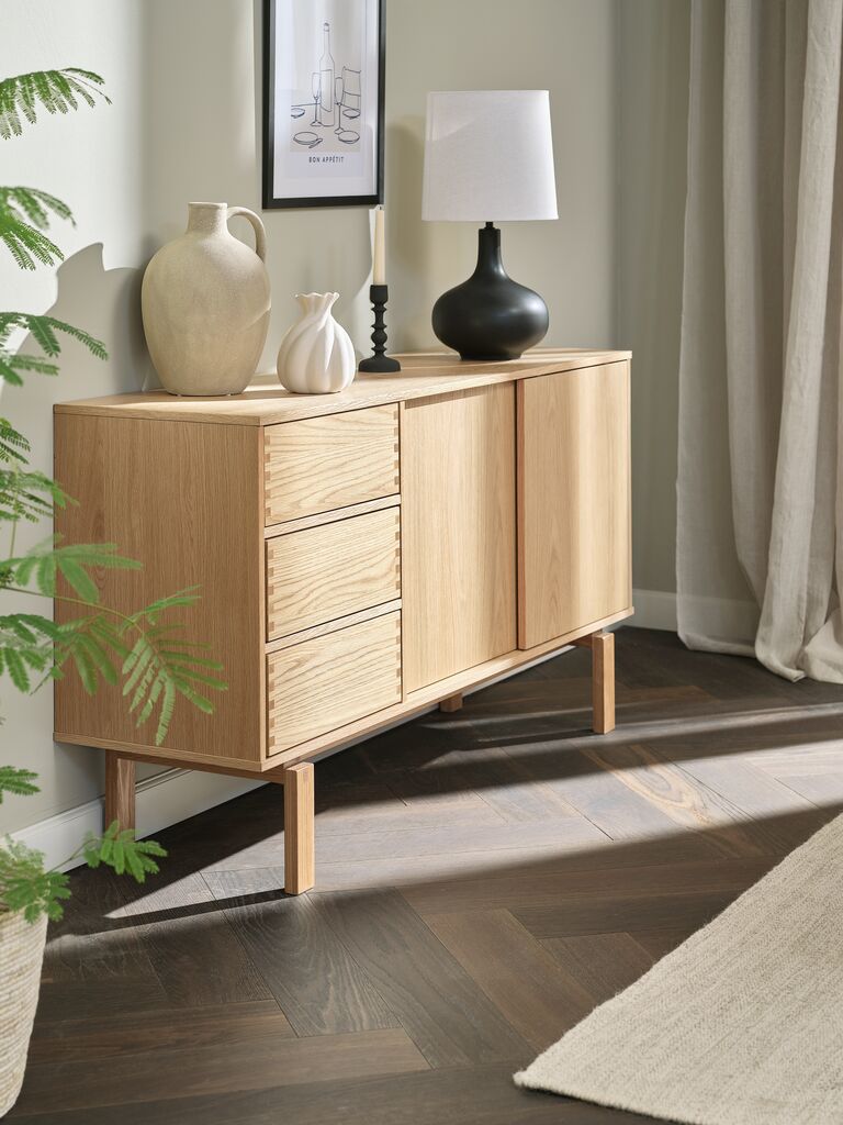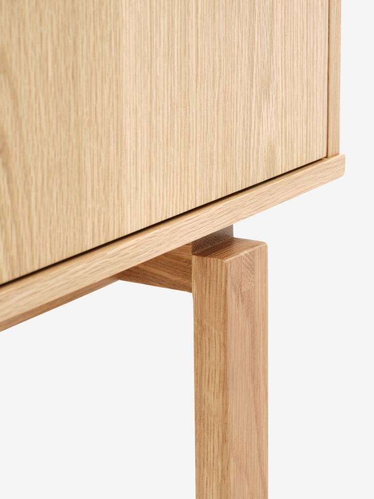 Jeg var litt usikker på denne skjenken pga "firkantene" i skuffene, men jeg trengte en skjenk med skyvedører pga plass. Jeg er veldig positivt overrasket over hvor fin den egentlig er. Jeg har den ved siden av Vesterby vitrineskap natur eik, de passer veldig godt sammen i farge. God plass i den. Liker at beina gjør det mulig å få den helt inntil veggen siden vi har gulvlister. Anbefales!
